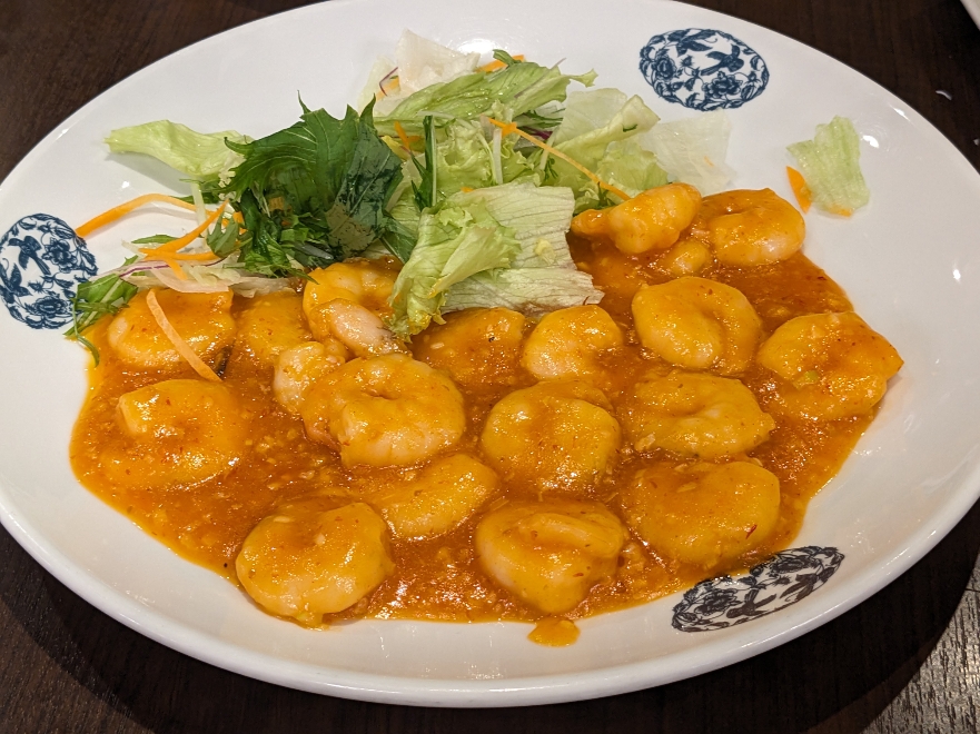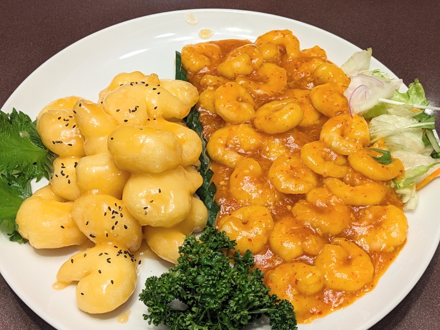 「海老の紅白仕立て」です。海老チリとエビマヨで紅白を表しています。海老チリもしっかりと良いお味でしたし、エビマヨもふんわりと揚げてありました。