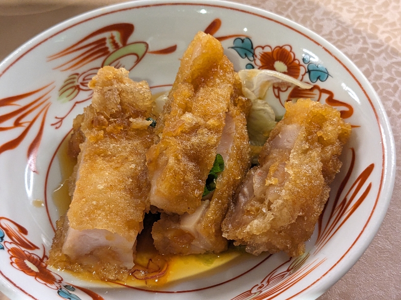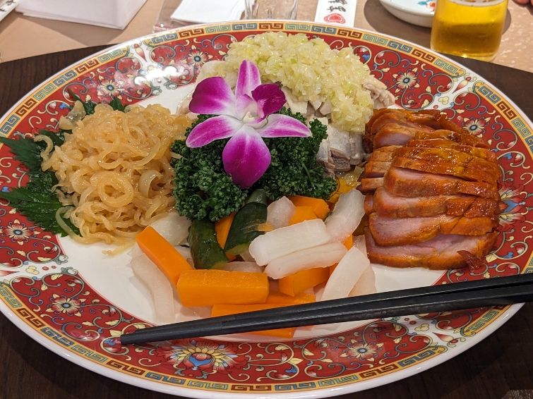 前菜です。窯焼きチャーシュー、蒸し鶏のねぎ生姜ソースかけ、野菜の甘酢漬けの三種盛合せです。