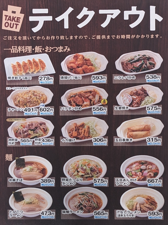 日高屋はテイクアウトもでいます。テイクアウトのメニューです。 ●焼き餃子(6個入) 300円 ●唐揚げ(7個入) 640円 ●ニラレバ炒め 580円 ●チャーハン 530円 ●バクダン炒め 600円 ●生姜焼き 620円 ●肉野菜炒め 810円 ●野菜炒め 470円 ●イカ揚げ 330円 ●五目春巻き 340円 ●中華そば 420円 ●野菜たっぷりタンメン 620円 ●五目あんかけラーメン 720円 ●とんこつラーメン 510円 ●味噌ラーメン 610円 ●汁なしラーメン 640円