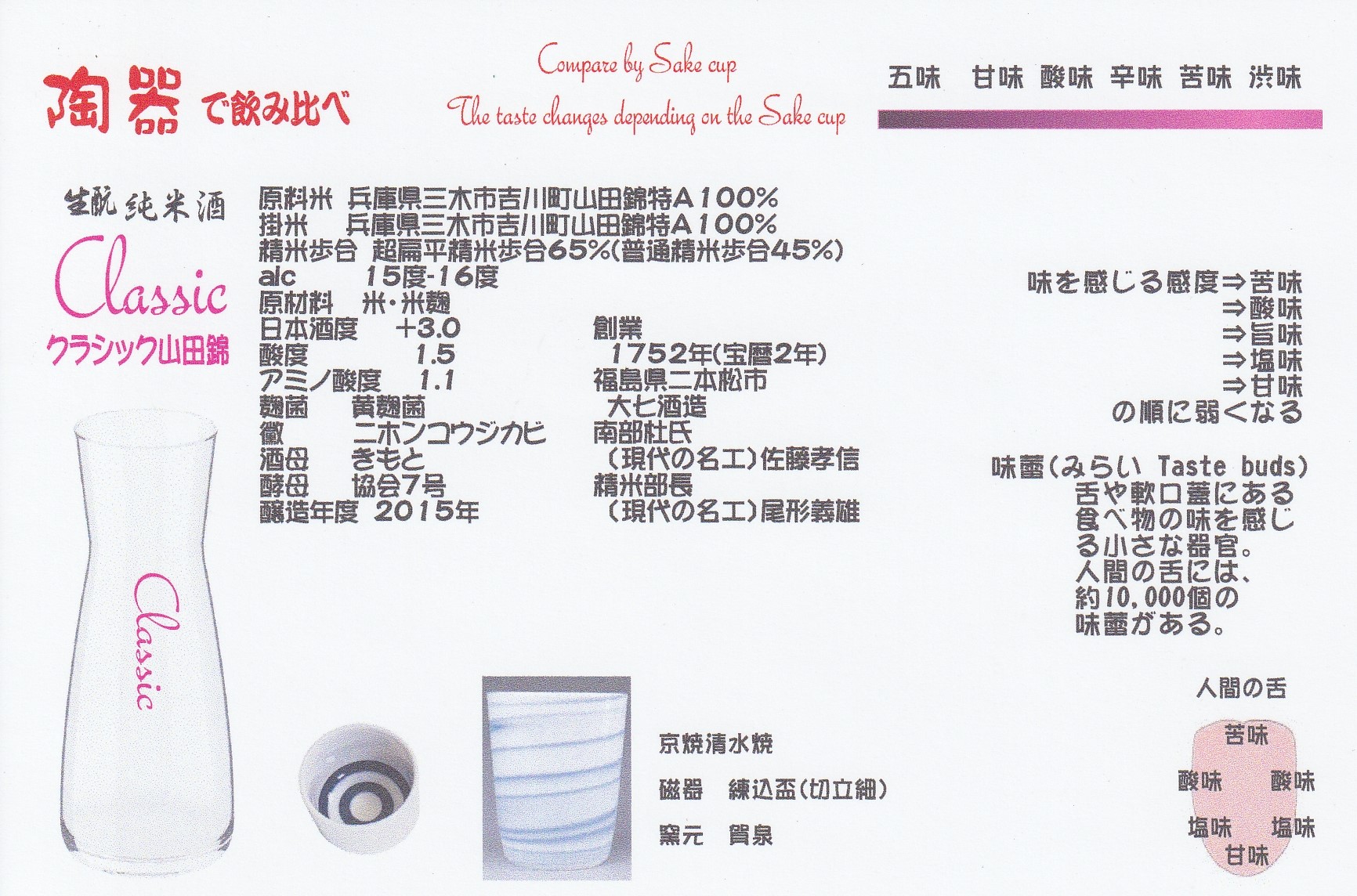 きもと純米Classic山田錦を陶器の器で飲み比べをします。陶器の盃と磁器のぐい飲みで飲み比べをします。磁器は〔京焼清水焼 窯元 賀泉〕です。