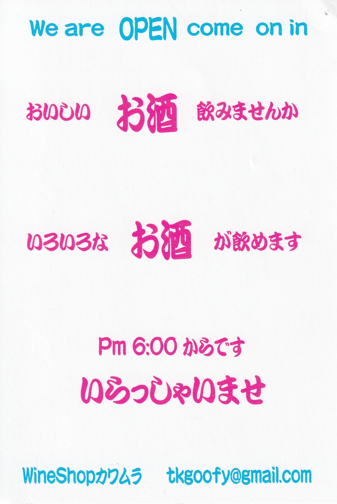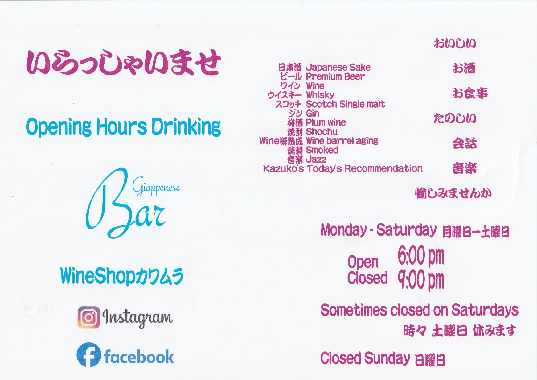 いらっしゃいませ 6:00 pm Open おいしいお酒 お食事 たのしい 会話 音楽 愉しみませんか
