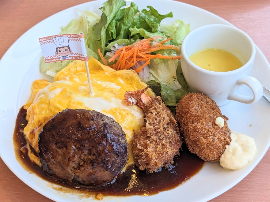 お子様ランチらしく、オムライスには旗が立っています。旗も不二家らしい旗です。
