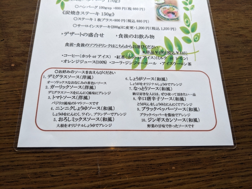 ハンバーグ、ステーキのソースは次の10種類から選べます。 1、デミグラスソース (洋風) 2、ガーリックソース (洋風) 3、トマトソース (洋風) 4、ニンニクしょうゆソース (和風) 5、おろしミックスソース (和風) 6、しょうがソース (和風) 7、なっとうソース (和風) 8、辛口唐辛子ソース (和風) 9、ブラックペッパーソース (和風) 10、ジンギスカンソース (和風)