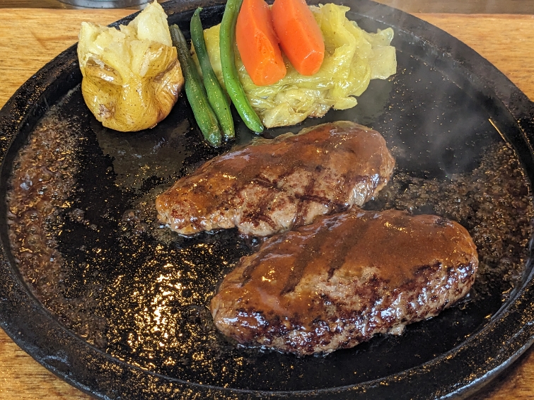 店員さんが鉄板上でハンバーグを二つに切って、中心部にも火を通してくれます。そして最後にソースをかけてくれて完成です。