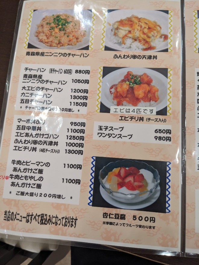 ●餃子 480円 ●青森産にんにく餃子 700円 ●春巻き 1本 230円 ●エビチリチーズ春巻き 660円 ●シュウマイ 600円 ●マーボ豆腐 800円 ●野菜炒め 750円 ●肉野菜炒め 800円 ●肉ナス炒め 800円 ●肉ピーマン炒め 800円 ●肉ニラ炒め 800円 ●レバニラ炒め 800円 ●レバ野菜炒め 800円 ●肉炒め 900円 ●肉玉ネギ炒め 800円 ●マーボーナス 800円 ●ホイコーロー 1,050円 ●とりのから揚げ 830円 ●ニラ玉 800円