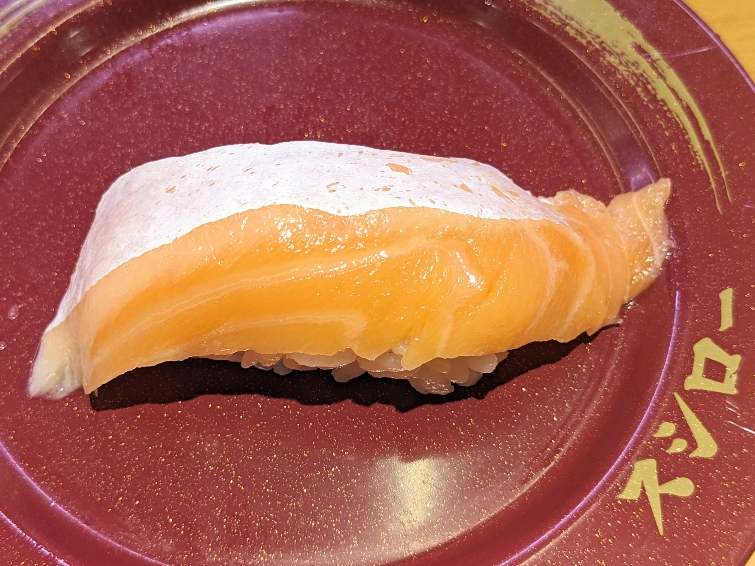 1貫で提供される「ジャンボとろサーモン」です。脂が乗っていて美味しいサーモンです。