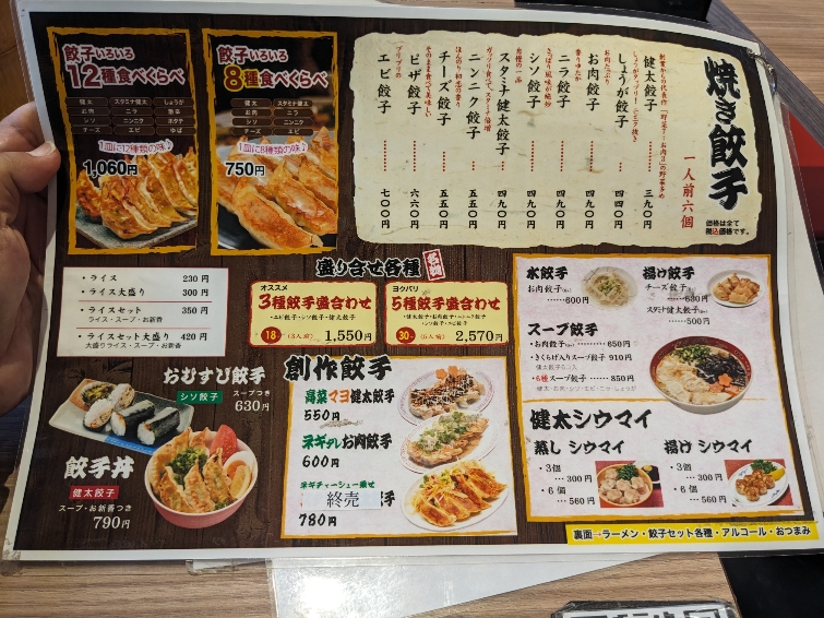 焼き餃子 ●健太餃子 390円 ●しょうが餃子 440円 ●お肉餃子 490円 ●ニラ餃子 490円 ●シソ餃子 490円 ●スタミナ健太餃子 490円 ●ニンニク餃子 550円 ●チーズ餃子 550円 ●ピザ餃子 660円 ●エビ餃子 700円