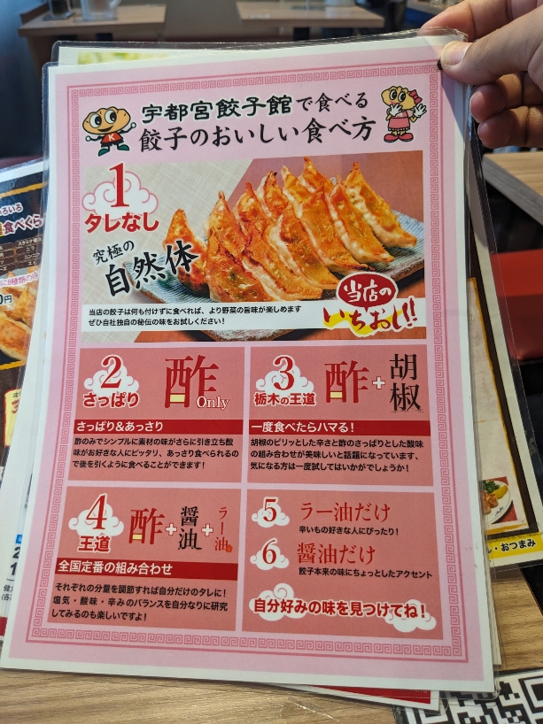餃子のおいしい食べ方 1.タレなし 2.酢 3.酢+胡椒 4.酢+醤油+ラー油 5.ラー油だけ 6.醤油だけ