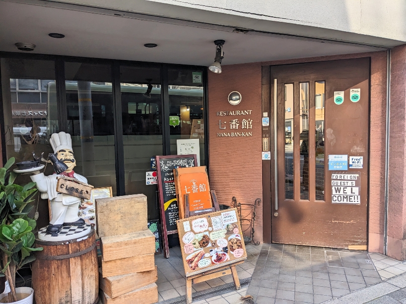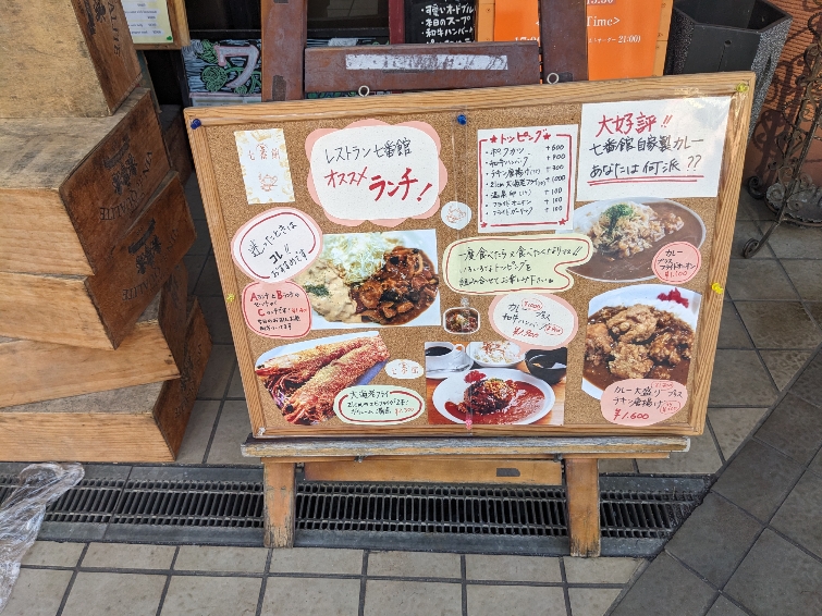 七番館自家製カレー カレー+フライドオニオン ¥1,100 カレー大盛り+チキン唐揚げ ¥1,600 カレー+和牛ハンバーグ ¥1,900 トッピング ・ポークカツ +¥600 ・和牛ハンバーグ +¥900 ・チキン唐揚げ +¥300 ・大海老フライ +¥1,000 ・温泉卵 +¥100 ・フライドオニオン +¥100 ・フライドガーリック +¥100