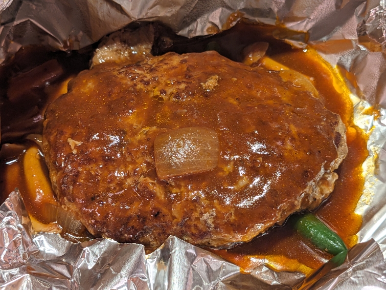 アルミに包まれた状態でハンバーグが出てきます。