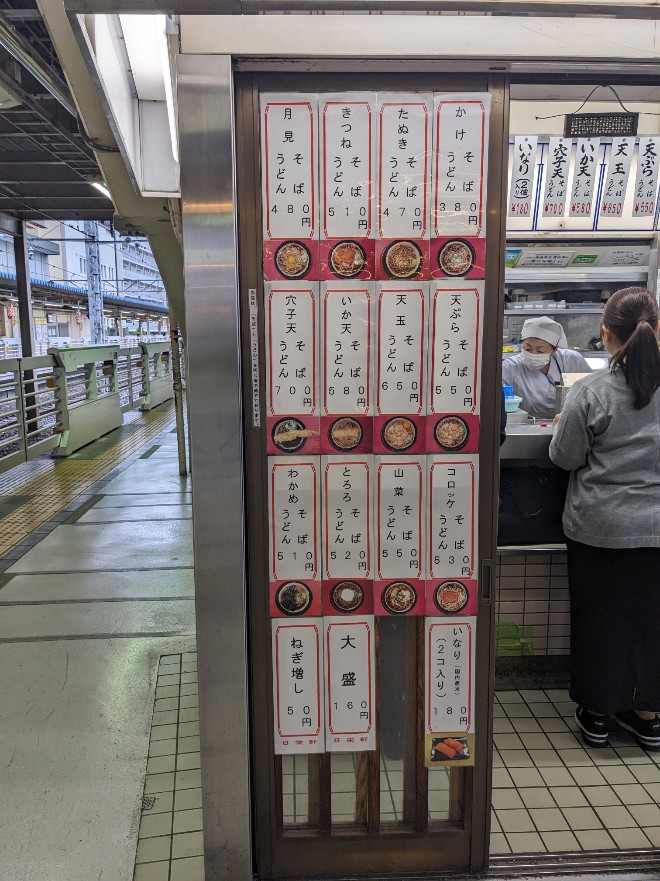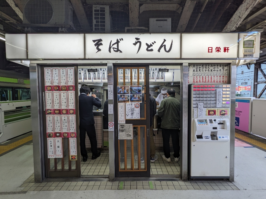 京浜東北線北行きがある3・4番線ホームにある立ち食いソバのお店。懐かしい駅の立ち食いソバです。最近はこういう佇まいのお店が無くなりました。ただし、席が5席しかないので、お昼時は店先に並んで待ちます。また、後ろの方に悪いので早く食べようと思い、少し忙しないです。一昔前のサラリーマンの日常のようですが、今でもサラリーマンの味方ですね。