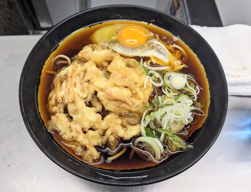 天玉そば、650円です。天ぷらと生玉子に白ネギが乗っています。ツユは出汁の香りのする美味しいものです。うどんと蕎麦が選べますが、お客さんは圧倒的に蕎麦の人が多いです。