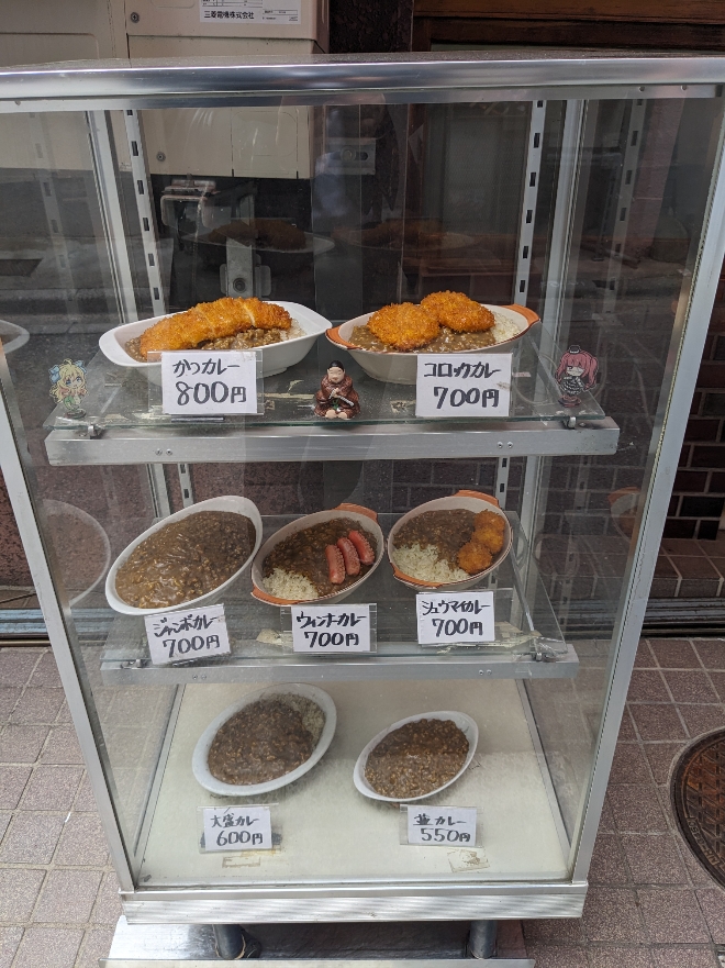 店頭のサンプルです。 ●カツカレー 800円 ●コロッケカレー 700円 ●ジャンボカレー 700円 ●ウィンナーカレー 700円 ●シュウマイカレー 700円 ●大盛カレー 600円 ●並カレー 550円