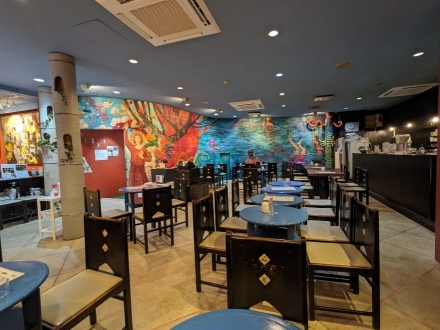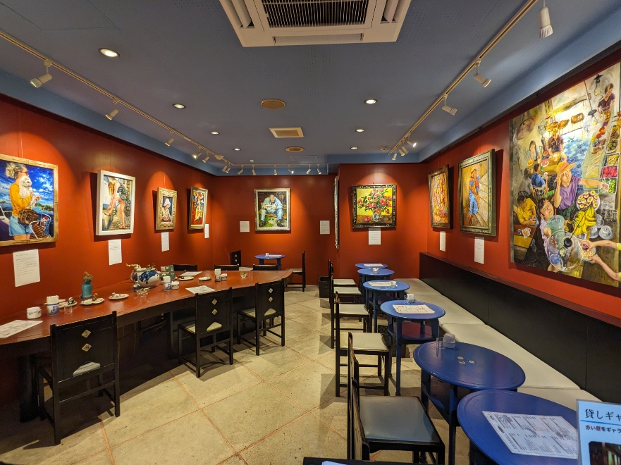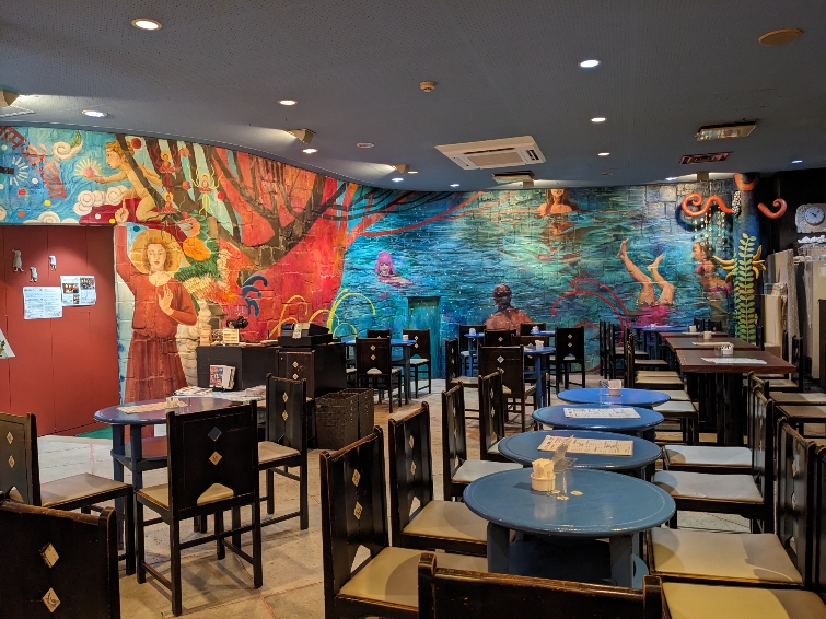壁に城戸真亜子さん作の壁画が描かれていて、落ち着いた雰囲気です。