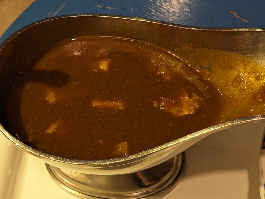 サラサラとした感じのカレーです。甘口を頼みましたが、意外にスパイシーです。爽やかな感じの辛さのカレーです。