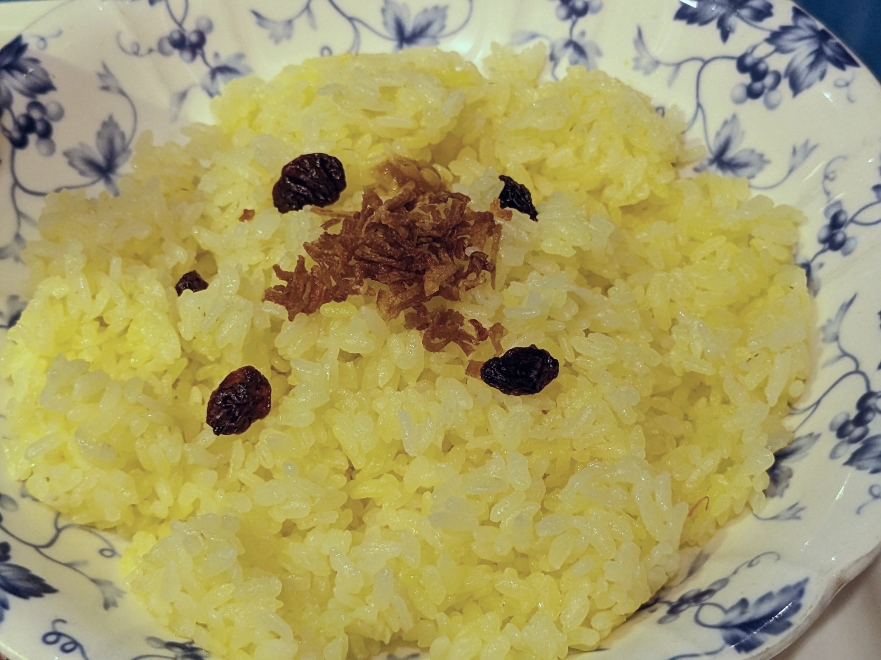 ライスはきちんとサフランライスです。干しレーズンと揚げオニオンチップが乗っています。
