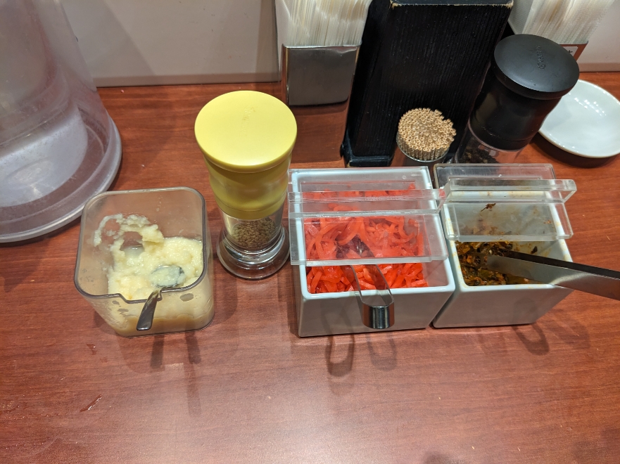 テーブルには、おろしニンニク、摺りゴマ、紅生姜、高菜漬けがあって、本格的です。