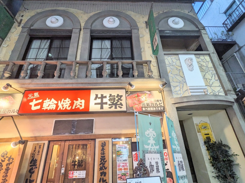 駅側からアーケードに入って右側、焼肉の牛繁の2階です。