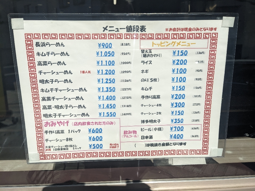 メニュー値段表 ●長浜らーめん ¥900 ●キムチらーめん ¥1,050 ●高菜らーめん ¥1,100 ●チャーシューめん ¥1,200 ●明太子らーめん ¥1,250 ●キムチチャーシューめん ¥1,350 ●高菜チャーシューめん ¥1,400 ●高菜・明太子らーめん ¥1,450 ●明太子チャーシューめん ¥1,550