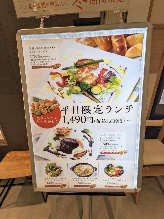 店頭の平日限定ランチの案内看板です。 ●若鶏と彩り野菜のグリル 1,963円 ●ベーコンのロティとカマンベールチーズ 1,639円 ●チキンのロティとペンネリガーテの クリームグラタン 1,793円 ●舌平目のプレゼ 2,189円