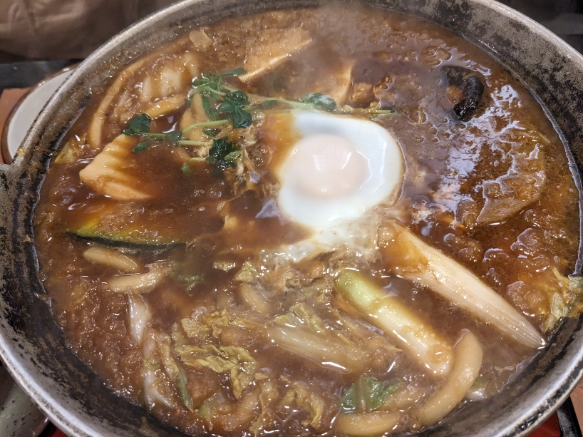 ちょっと濃い目の秘伝味噌で作られた煮込みうどん。アツアツをどうぞ。