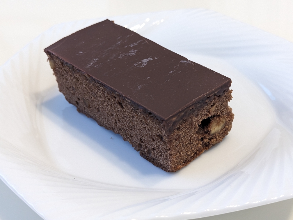 和菓子屋さんですが、洋風のクーベルチがおいしいです。チョコレートでコーティングされています。スポンジの部分はクルミも入っています。310円です。