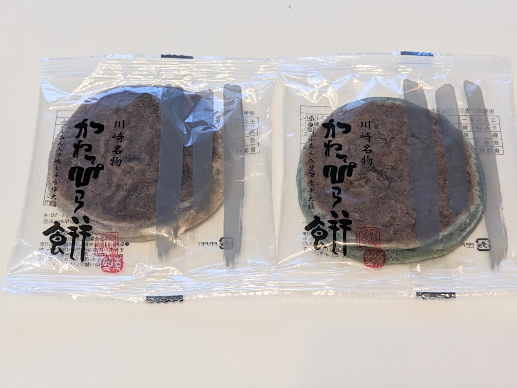 川崎名産品にも指定されている「かわっぴら餅餅」です。粒あん入りのよもぎ餅、こしあん入りの甘醤油餅の2種類があります。各180円です。