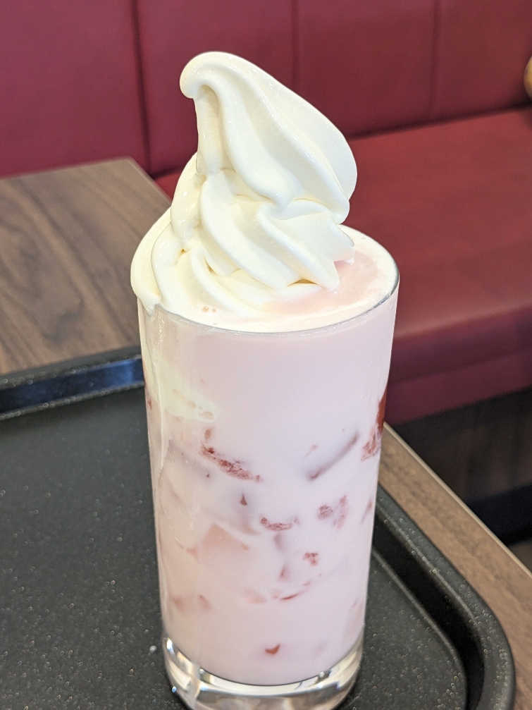 今だけ季節限定のイチゴとミルクのフロートです。春らしい甘さと爽やかな酸味が美味しいドリンクです。