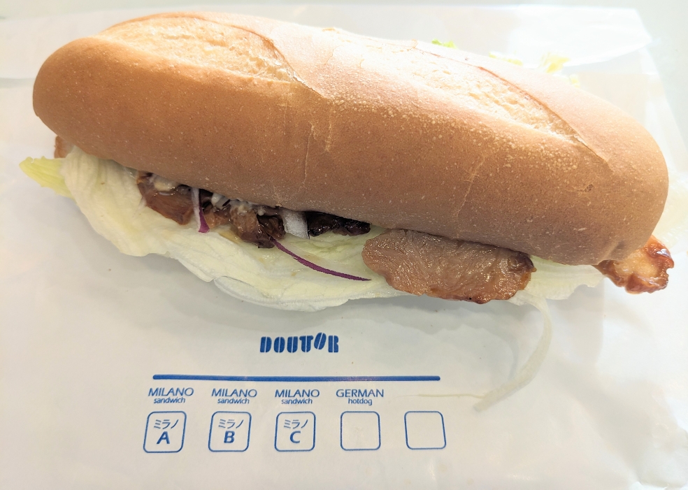 ドトール定番のミラノサンド。生ハム、ボンレスハム、ボローニャソーセージの3種のハム、ソーセージが入ったお馴染みのミラノサンドAです。マヨネーズとの相性の良さも好き。モーニングにも、ランチにも最適な軽食です。