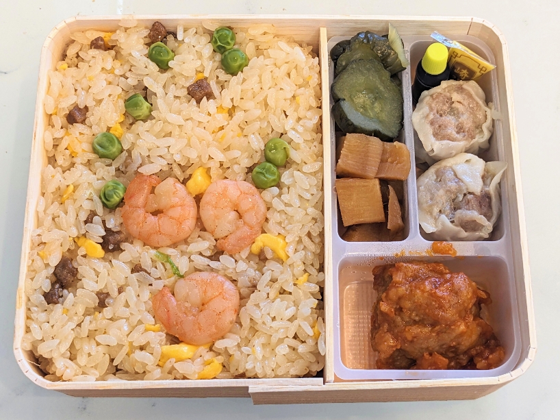 炒飯と焼売、チリ唐揚げのお弁当です。炒飯弁当より一回り小さいサイズです。