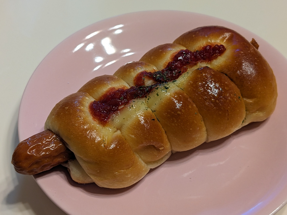 「デンマークウインナーロール」です。 ヴィ・ド・フランスの定番的なパンです。 ウインナー自体も美味しくて、ケチャップとの相性も最高です。