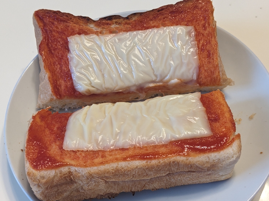 チーズを乗せて焼いて、ピザ風トーストにするとパンの厚みもあって一層美味しいです。
