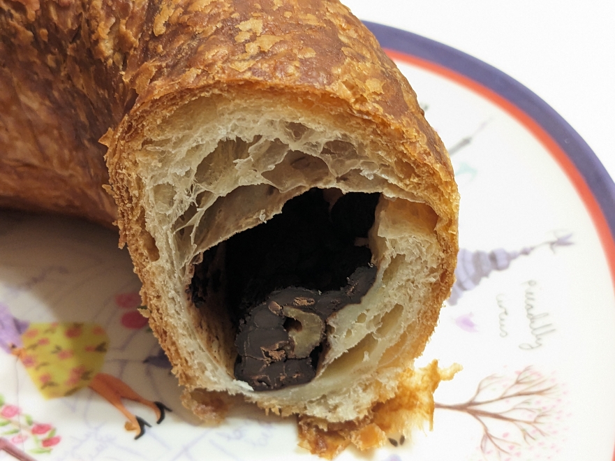 クルミが入ったビターなチョコレートが、リング状のデニッシュのパンの中に入っています。全体としては結構甘味の強いパンです。