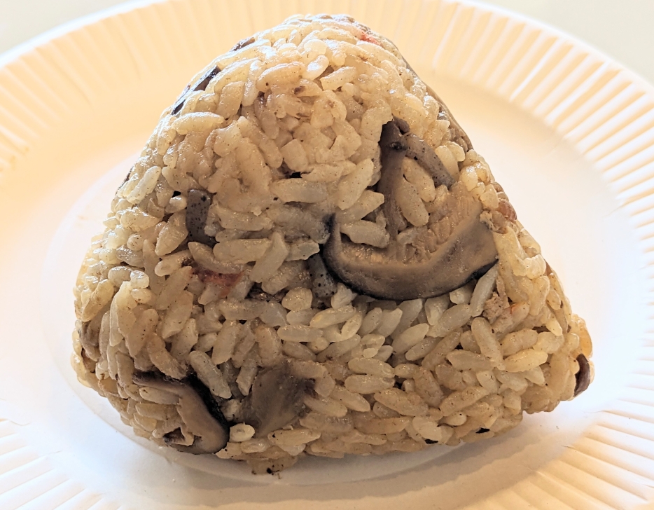 鶏肉の他、椎茸、しめじ、こんにゃく、人参など具沢山のおにぎりです。