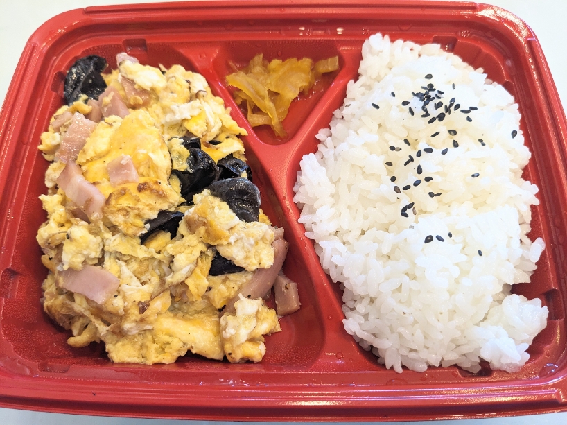 「スマイル!きくらげと玉子の塩炒め弁当」¥529です。塩で味付けされた炒め物です。結構玉子も多くてボリュームもあります。ただ、塩の味付けが少しきつく感じました。