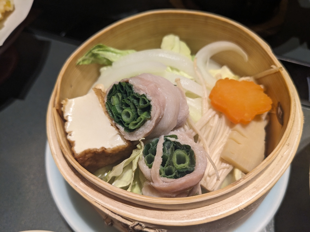 蒸籠蒸しです。季節の野菜と、豚肉を巻いた野菜などが入っています。固形燃料のコンロで蒸して仕上げていきます。