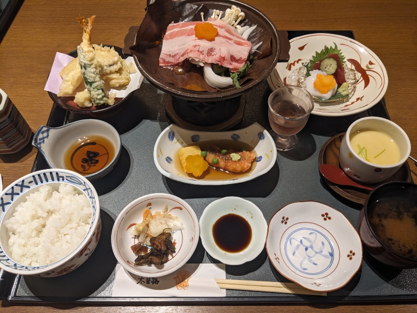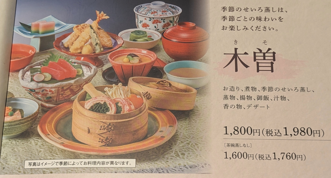 季節の蒸籠蒸しを中心としたランチの「木曽」です。お造りや天ぷら、煮物も付いています。
