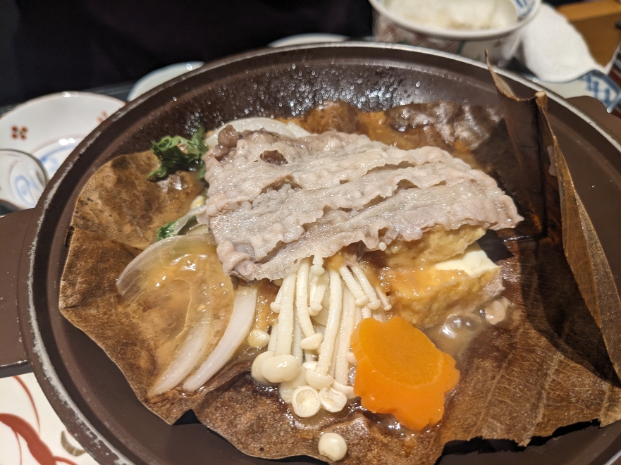 「朴葉味噌焼き」が仕上がった状態です。甘味のある味噌とよく合っていてとても美味しいです。