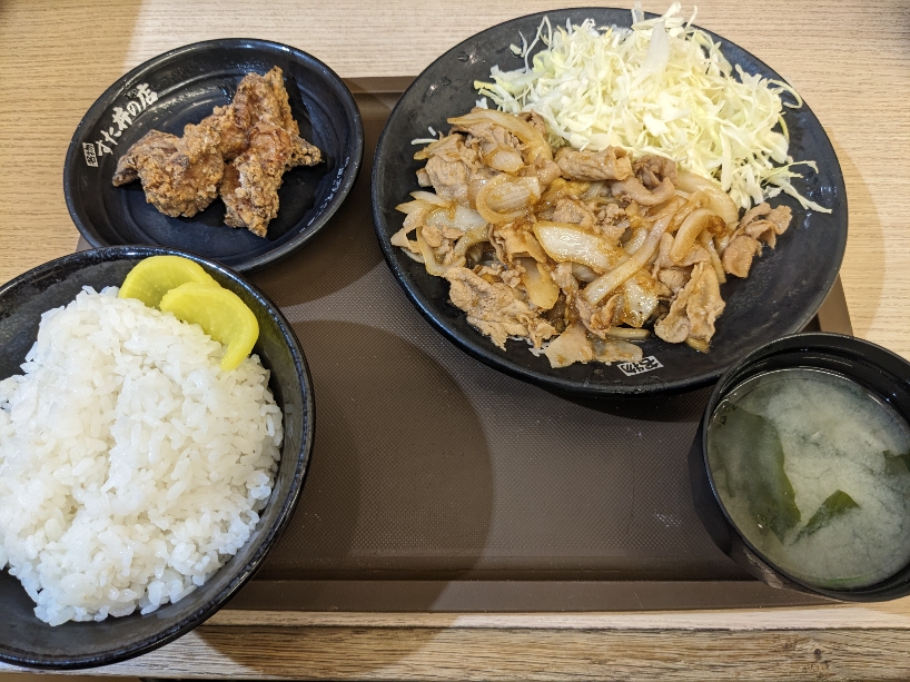 「生姜焼き定食」です。ニンニク不使用なので、人に会う予定がある時などに助かります。写真はご飯少なめの「飯八分目」ですが、ボリュームは充分にあります。サイドメニューの「唐揚げ2個」を付けています。