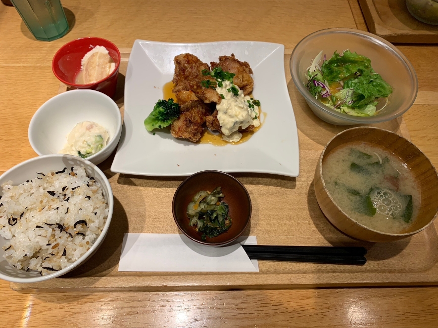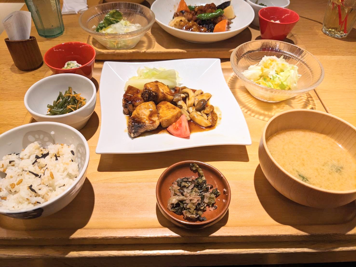 「めかじきのはちみつ生姜照り焼きソース」です。ご飯と味噌汁、小鉢、香の物が付いてきます。1,580円です。