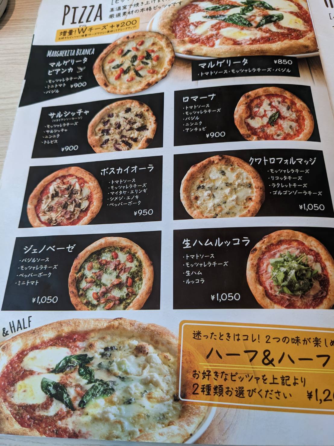 ピッツァ ●マルゲリータビアンカ ¥900 ●マルゲリータ ¥850 ●サルシッチャ ¥900 ●ロマーナ ¥900 ●ボスカイオーラ ¥950 ●クワトロフォルマッジ ¥1,050 ●ジェノベーゼ ¥1,050 ●生ハムルッコラ ¥1,050 ●ハーフ&ハーフ ¥1,250