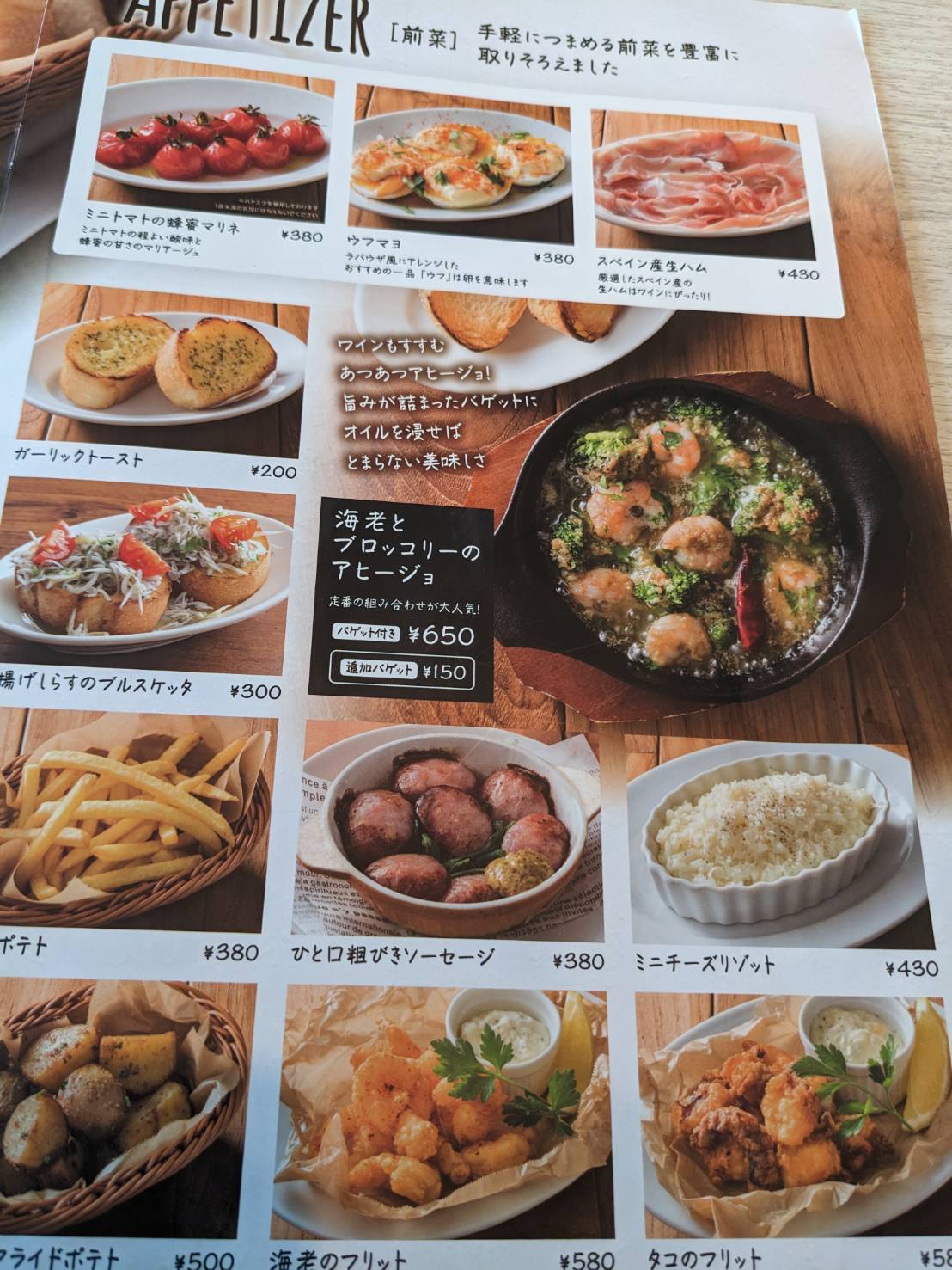 前菜 ●ミニトマトの蜂蜜マリネ ¥380 ●ウフマヨ ¥380 ●スペイン産生ハム ¥430 ●ガーリックトースト ¥200 ●揚げしらすのブルスケッタ ¥300 ●海老とブロッコリーのアヒージョ ¥650 ●ひと口粗びきソーセージ ¥380 ●ミニチーズリゾット ¥430 ●フライドポテト ¥500 ●海老のプリット ¥580 ●タコのフリット ¥580