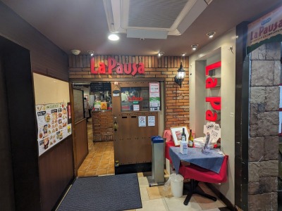 ビル1F入口にあるメニュー看板です。 パスタ、ピザ、ハンバーグ、アペタイザー、サラダ、デザートが書かれています。