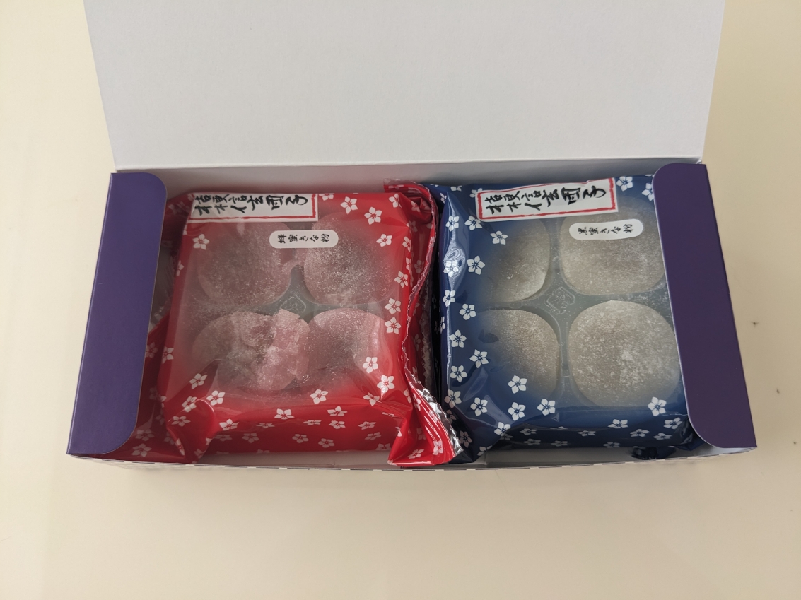 紅白のお団子が綺麗です。 白 :濃い黒蜜ときな粉 ピンク:蜂蜜が入った黒蜜と黒大豆のきな粉