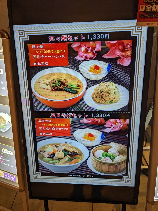 お店前の看板。 ●担々麺セット ¥1,330 ●五目そばセット ¥1,330