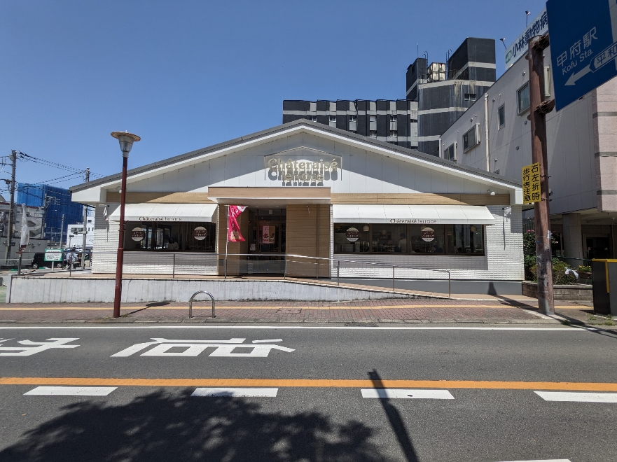 甲府駅南口から県庁前交差点を右折、徒歩数分で着きます。ケーキ屋さんのシャトレーゼと違い、店内で喫茶ができます。