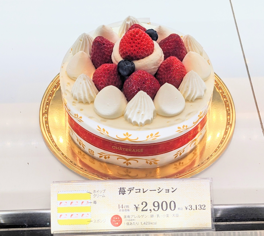 ショーウインドーの中の「苺デコレーション」です。こちらは14cmサイズで3,132円です。