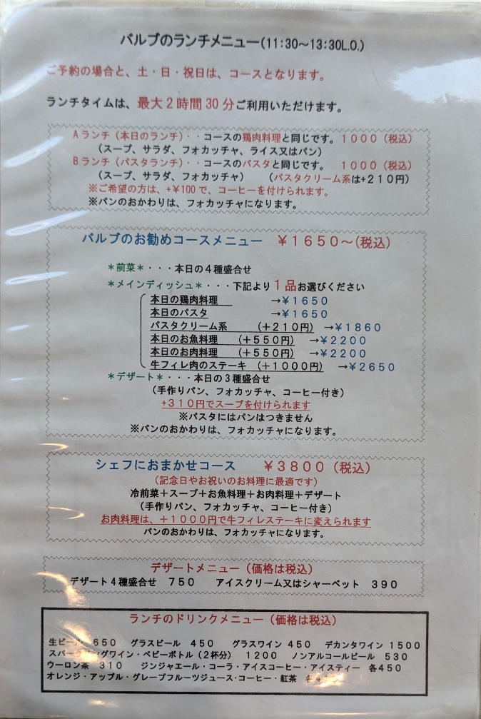 バルブのお勧めコースメニュー ●本日の鶏肉料理 ¥1650 ●本日のパスタ ¥1650 ●パスタクリーム系 ¥1860 ●本日のお魚料理 ¥2200 ●本日のお肉料理 ¥2200 ●牛フィレ肉のステーキ ¥2650 ●シェフにおまかせコース ¥3800