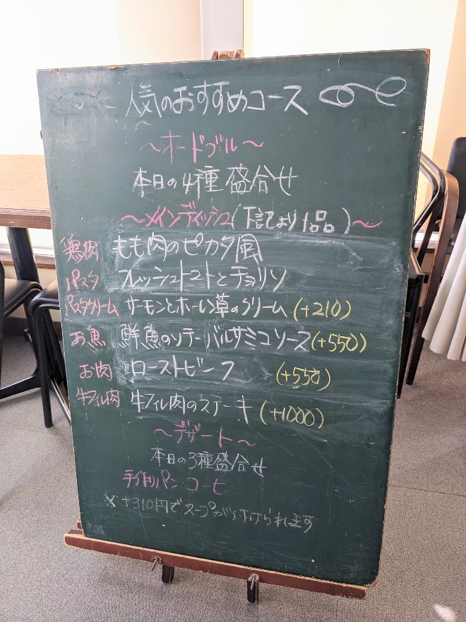黒板での本日のメインディッシュの案内 ・鶏肉 もも肉のピカタ風 ・パスタ フレッシュトマトとチョリソ ・パスタクリーム サーモンとホーレン草のクリーム ・お魚 鮮魚のソテー バルサミコソース ・お肉 ローストビーフ ・牛フィレ肉 牛フィレ肉のステーキ