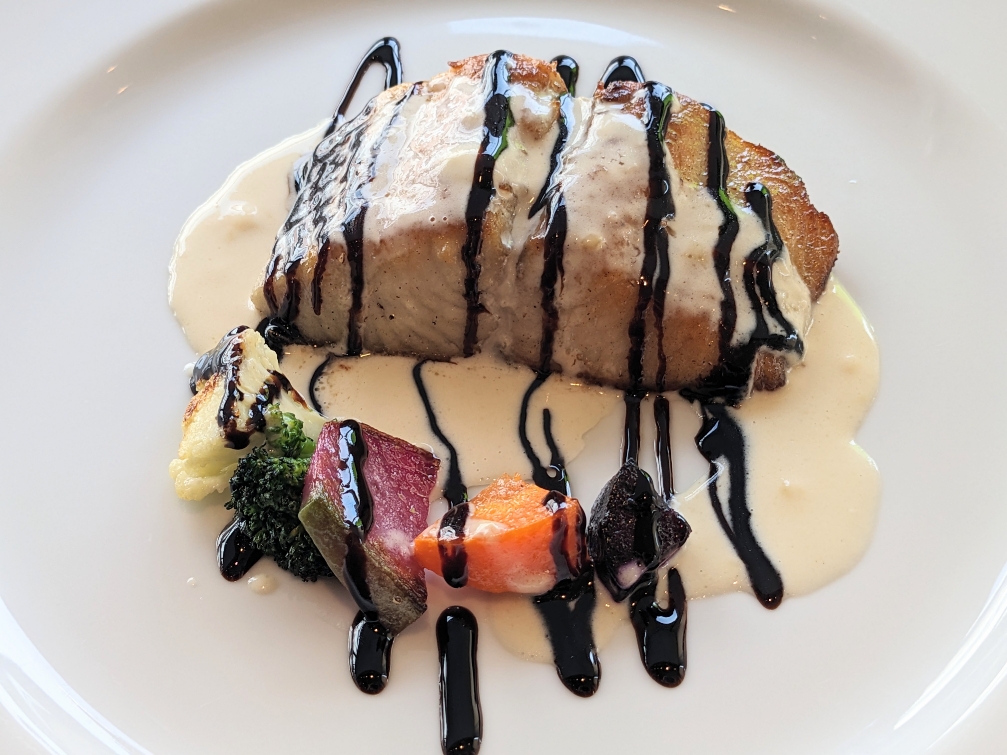 メインディッシュの魚料理、鰆のソテー、バルサミコソースです。バルサミコソースが料理の味を引き立てています。